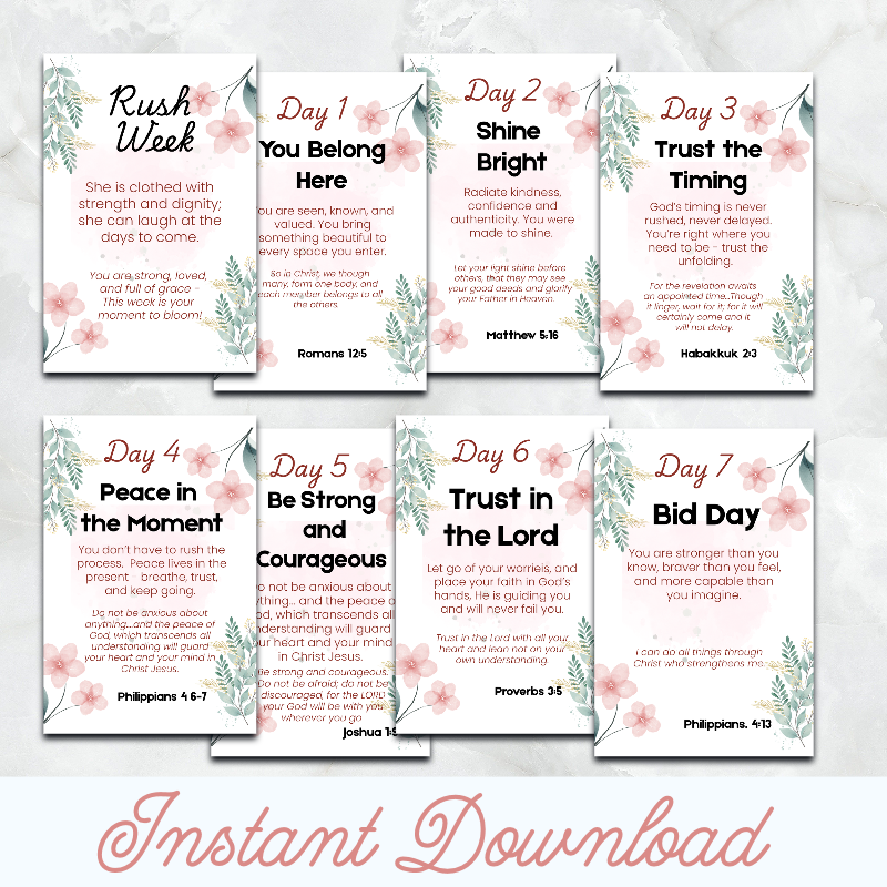 These printable Sorority Rush Encouragement Cards are designed to uplift and support young women as they begin one of the most emotional and transformative journeys of college life.