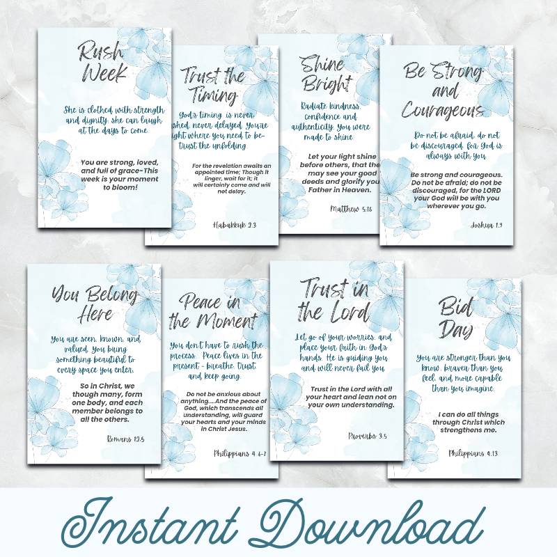 These printable blue floral Sorority Rush Encouragement Cards are designed to uplift and support young women as they begin one of the most emotional and transformative journeys of college life.